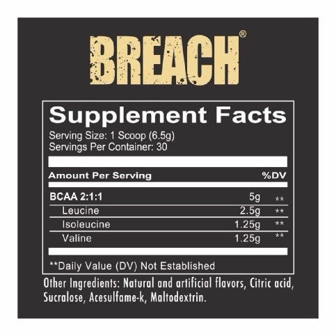 Redcon1 Breach is a high-quality BCAA (Branched-Chain Amino Acids) supplement designed to support muscle recovery, growth, and endurance for athletes and fitness enthusiasts. Each serving delivers a scientifically-backed 2:1:1 ratio of essential BCAAs — L-Leucine, L-Isoleucine and L-Valine — the key amino acids your body needs to repair muscle tissue, reduce fatigue, and support protein synthesis after intense workouts.